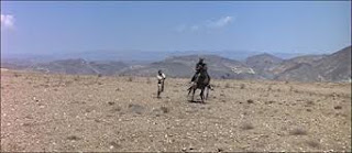 Desde sempre, Leone teve como sua marca  os grandes planos de rostos e das armas antes e durante  um duelo, que lhe permitem encenar e misturar cenas de rostos extremos, grandes planos épicos, com os diálogos reduzidos ao minímo, onde as mãos, quase em câmara lenta, se dirigem para as armas nos coldres e também grandes sequências sem um único diálogo. Tudo isto cria um ambiente de tensão e suspense que permite ao espectador saborear os desempenhos de cada personagem e perceber as suas reacções, mas também dá ao realizador a possibilidade de filmar belas paisagens. Não é, portanto, de estranhar que o inicio deste filme seja precisamente um grande plano de rostos de cowboys, das suas armas e de uma cidade em ruínas e sem um único diálogo, antes do duelo onde nos será apresentado o primeiro protagonista do trio central da história: a imagem, depois do duelo, congela e surge o título da personagem no écran; é um achado fabuloso de Leone e que funcionará da mesma maneira para as outras duas personagens do filme. Só então é que o filme começa verdadeiramente.
